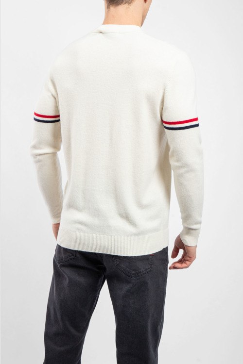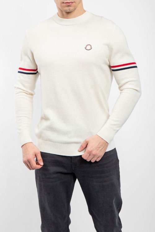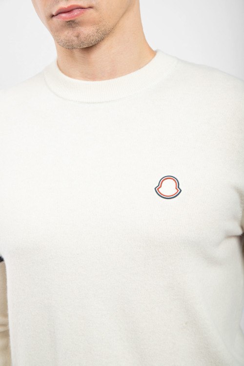Мужской джемпер молочного оттенка от Moncler (Монклер). Логотип на груди, круглый вырез горловины, классическая длина, ребристые манжеты и нижний край.