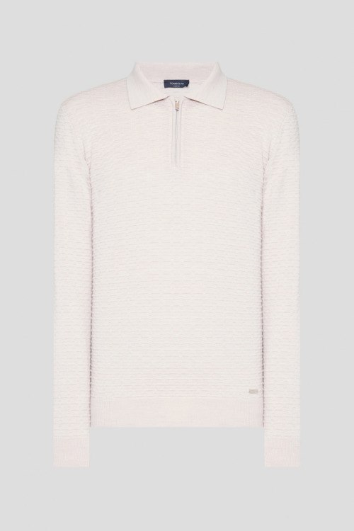 Детали: Мужской кремовый шерстяной джемпер-поло от Tombolini (Томболини). Фактурная вязка, отложной воротник, застежка-молния, классическая длина. Длина рукава: длинный, для размера 50 - 65 см, обхват груди: для размера 50 - 106 см, обхват талии: для размера 50 - 106 см, длина изделия по среднему шву спинки от горловины: для размера 50 - 68 см
