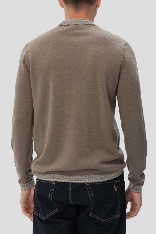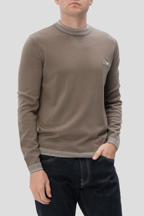 Детали: Мужской шерстяной джемпер цвета тауп от Emporio Armani (Эмпорио Армани). Логотип на груди, круглый вырез горловины, классическая длина, ребристые манжеты и нижний край
