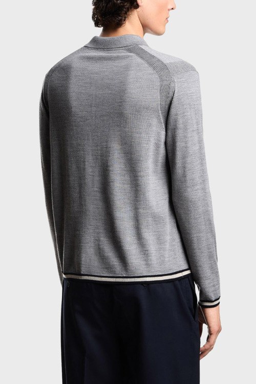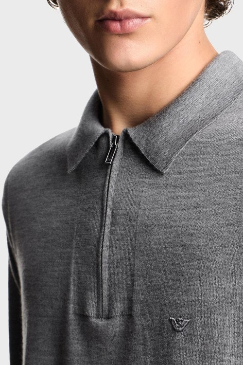 Детали: Мужской серый шерстяной джемпер-поло от Emporio Armani (Эмпорио Армани). Логотип на груди, отложной воротник, застежка-молния, длинный рукав, классическая длина