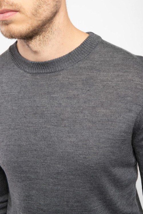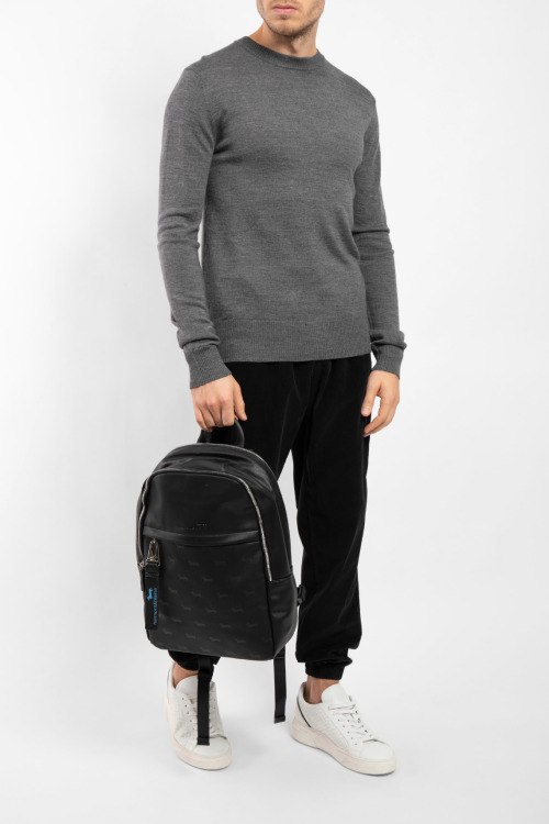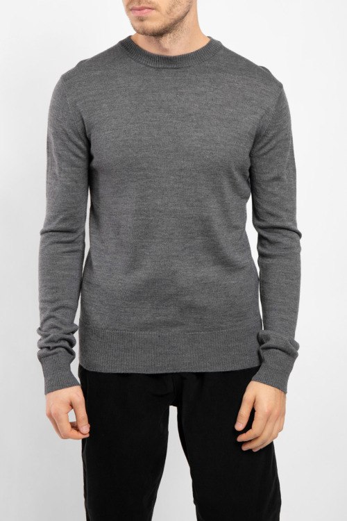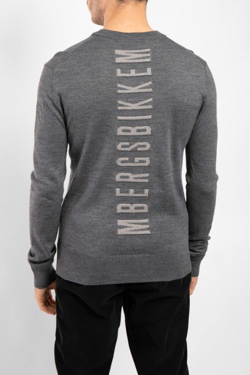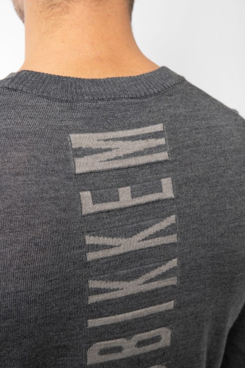 Мужской серый джемпер из шерстяного микса от Bikkembergs (Биккембергс). Классическая длина, круглый вырез горловины, длинные рукава, трикотажная резинка на манжетах и по низу изделия, брендированный принт на спине.
