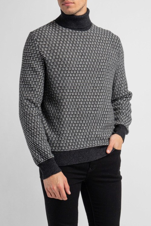 Детали: Мужской серый свитер из шерстяного микса от Gutteridge (Гаттеридж). Крупная вязка, меланжевый узор, высокий воротник, контрастные манжеты и нижний край