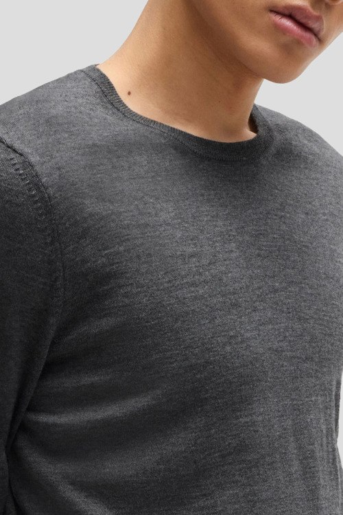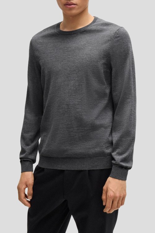 Детали: Мужской серый джемпер из натуральной шерсти от Hugo Boss (Хуго Босс). Классическая длина, круглый вырез горловины, длинные рукава, манжеты и низ изделия в рубчик