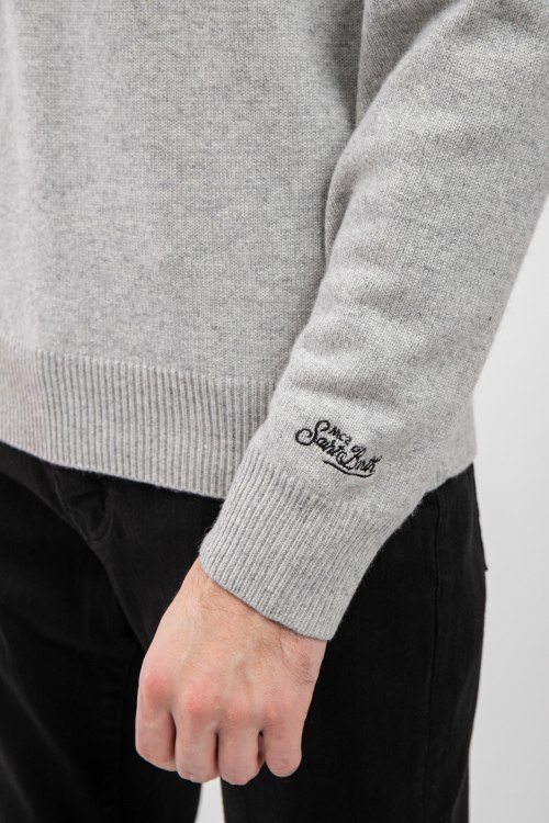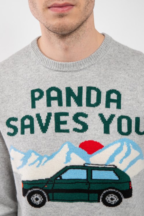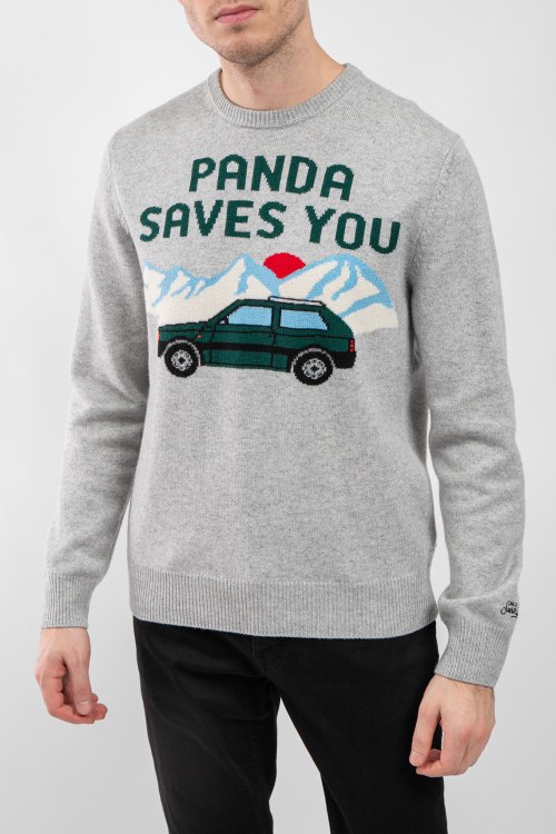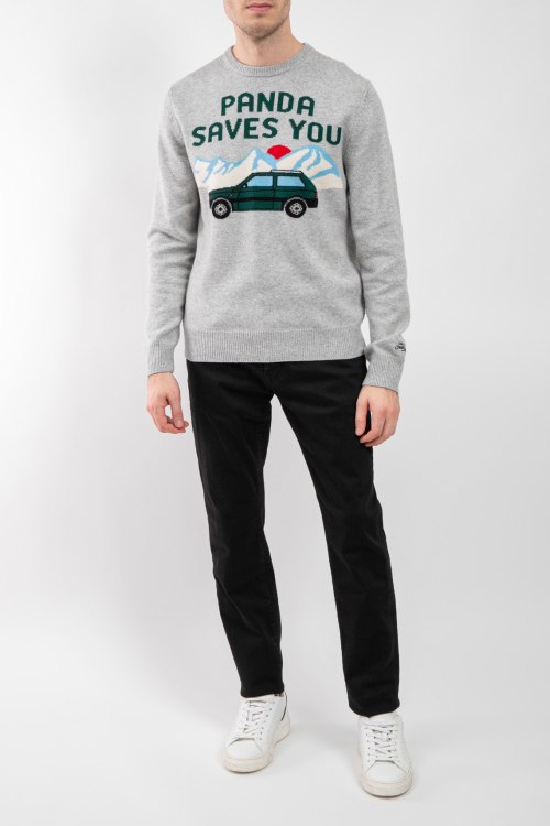Мужской серый джемпер из шерсти и вискозы Panda Saves You от Mc2 Saint Barth (Mc2 Сент Барт). Узор на груди, вышитый логотип на рукаве, круглый вырез горловины, классическая длина, манжеты и нижний край в рубчик.