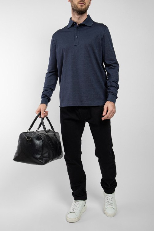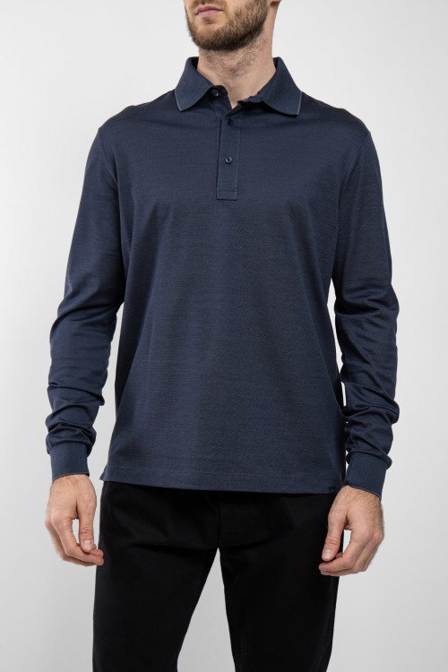 Мужской темно-серый джемпер-поло из хлопка от Paul & Shark (Пол энд Шарк). Классический воротник, горловина на пуговицах, длинные рукава, по бокам разрезы.