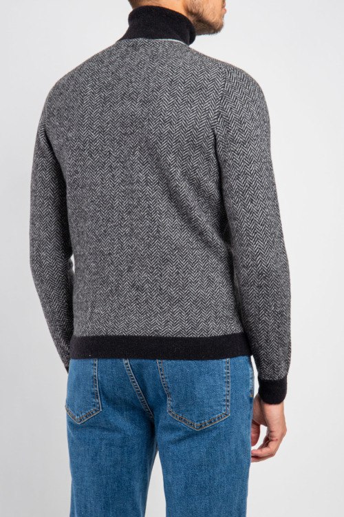 Детали: Мужской темно-серый гольф из микса шерсти и кашемира от Piacenza Cashmere (Пьяченца Кашемир). Классическая длина, высокий воротник-стойка с отворотом, длинные рукава, трикотажная резинка на манжетах и по низу изделия. Модель с парфюмированной пропиткой