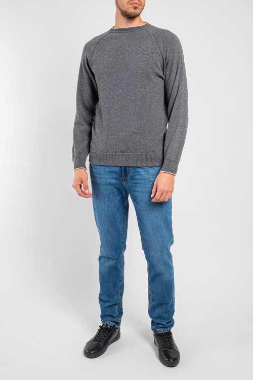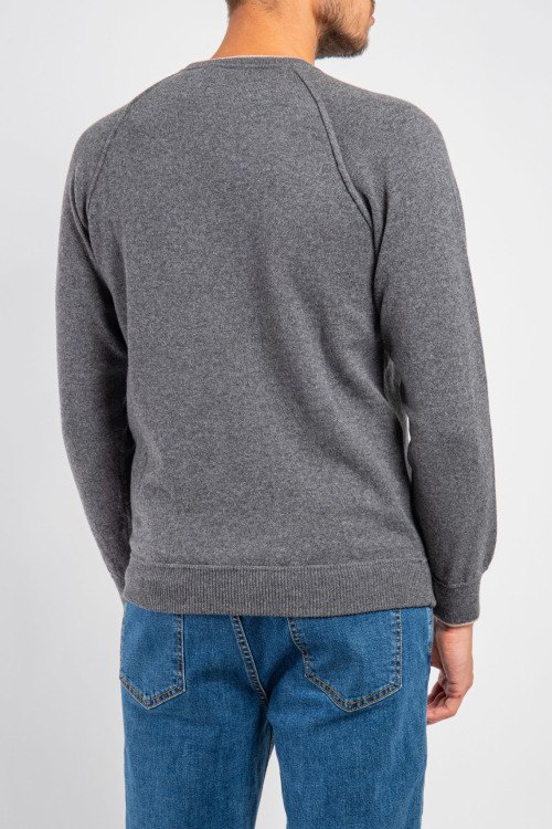 Детали: Мужской серый джемпер из кашемира от Piacenza Cashmere (Пьяченца Кашемир). Модель с парфюмированной пропиткой, классическая длина, круглый вырез горловины, длинные рукава-реглан, трикотажная резинка на манжетах и по низу изделия, дизайн с узором