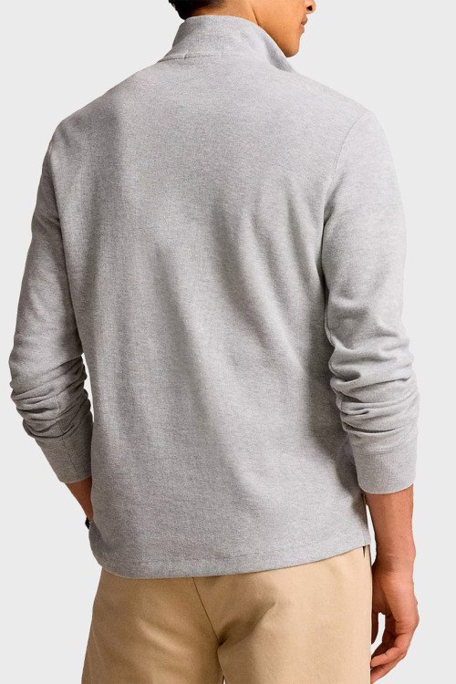 Детали: Мужской серый джемпер-поло из хлопка от Polo Ralph Lauren (Поло Ральф Лорен). Классическая длина, высокий воротник-стойка, застежка на молнию, длинные рукава, трикотажная резинка на манжетах и по низу изделия, вышитый лого