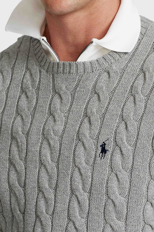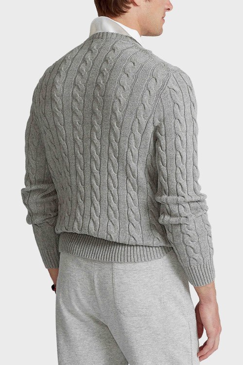 Детали: Мужской серый джемпер из хлопка от Polo Ralph Lauren (Поло Ральф Лорен). Классическая длина, круглый вырез горловины, длинные рукава, трикотажная резинка на манжетах и по низу изделия, вышитый лого