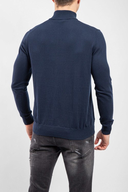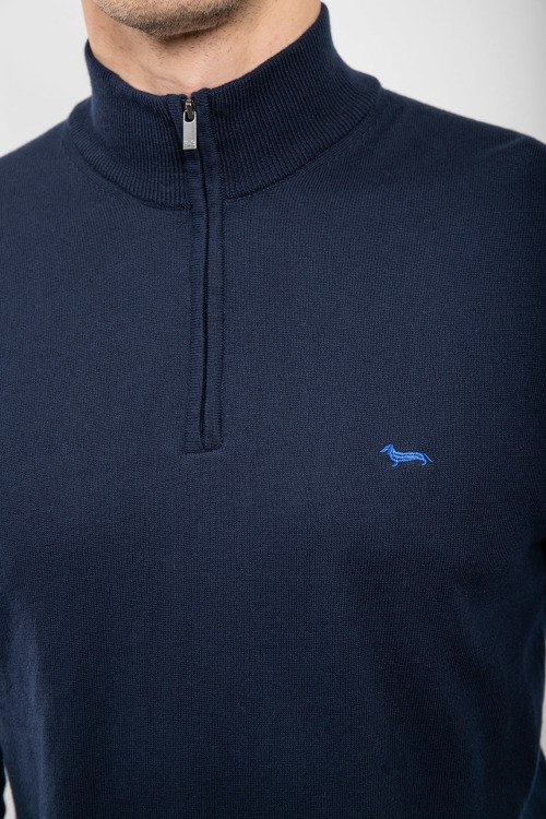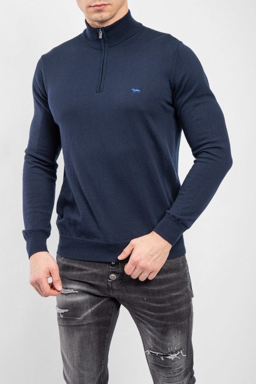 Мужской темно-синий джемпер из хлопка и шерсти от Harmont & Blaine (Хармонт энд Блейн). Классическая длина, высокий воротник-стойка, застежка на молнию, длинные рукава, трикотажная резинка на манжетах и по низу изделия, вышитый лого на груди.