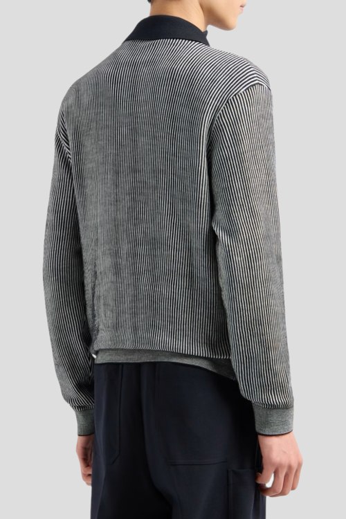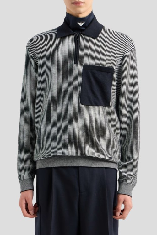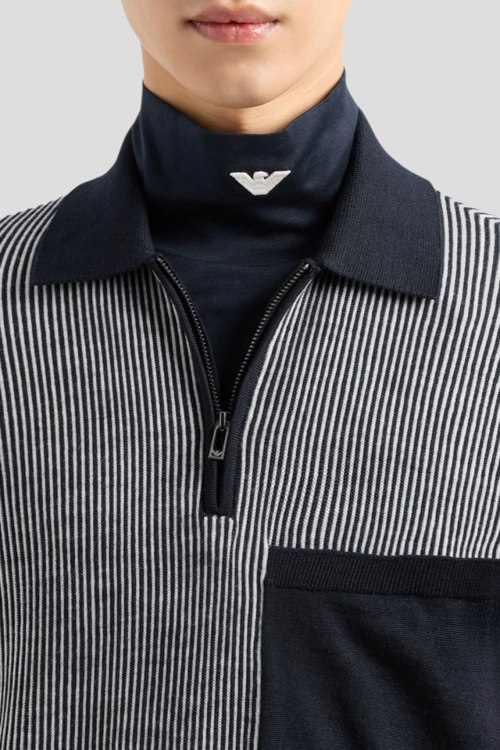 Детали: Мужской сине-белый шерстяной джемпер-поло от Emporio Armani (Эмпорио Армани). Полоска по всей поверхности, отложной воротник, застежка-молния, накладной карман на груди, классическая длина