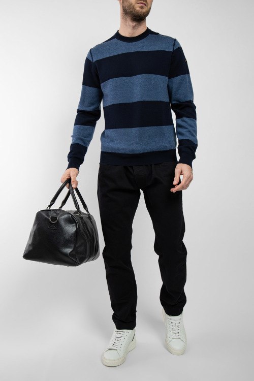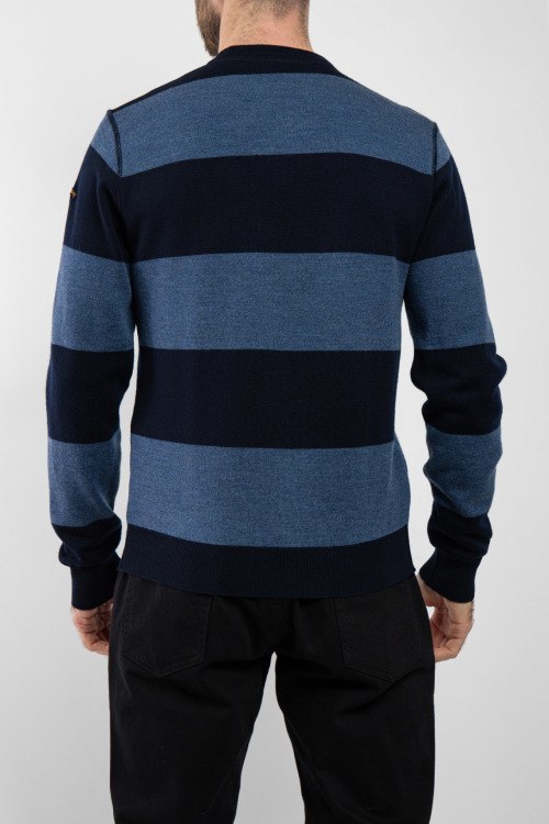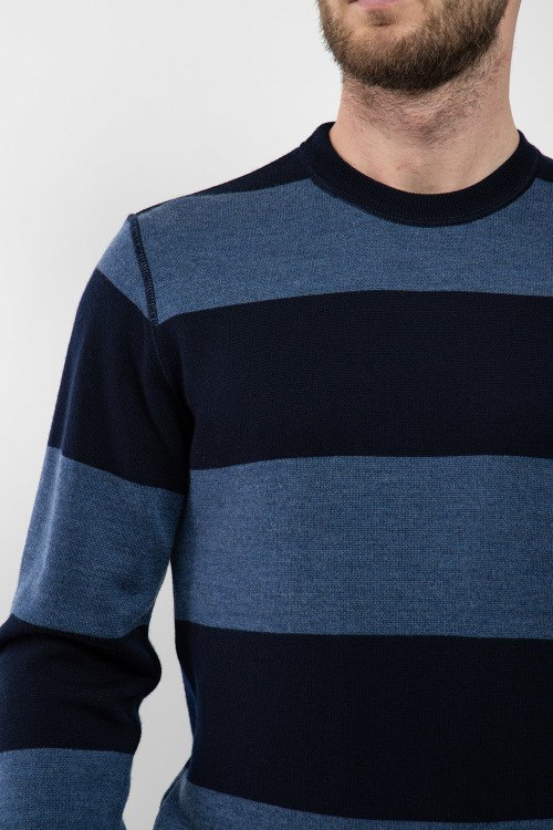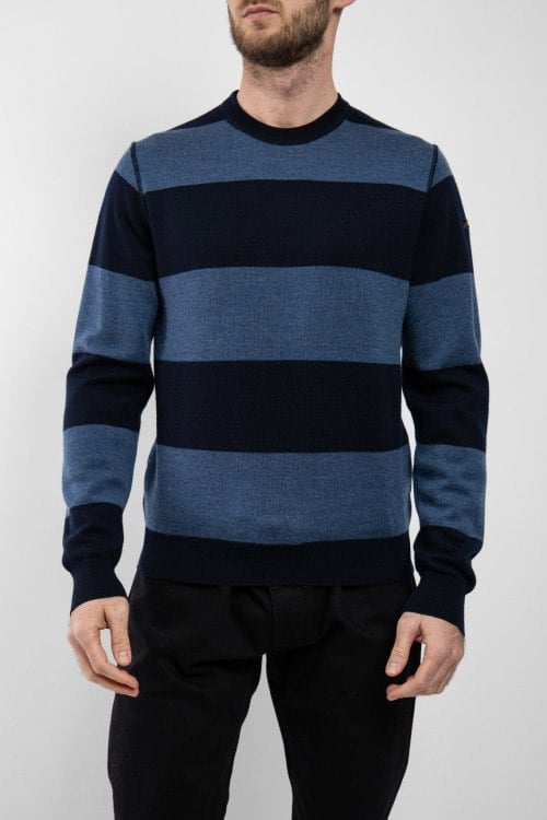 Мужской темно-синий джемпер из шерсти от Paul & Shark (Пол энд Шарк). Классическая длина, круглый вырез горловины, дизайн в полоску, длинные рукава, манжеты и низу изделия на трикотажной резинке, дизайн в полоску.