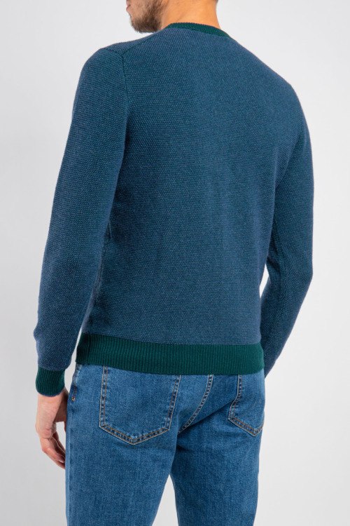 Детали: Мужской темно-синий джемпер из кашемира от Piacenza Cashmere (Пьяченца Кашемир). Модель с парфюмированной пропиткой, классическая длина, круглый вырез горловины, длинные рукава, трикотажная резинка на манжетах и по низу изделия