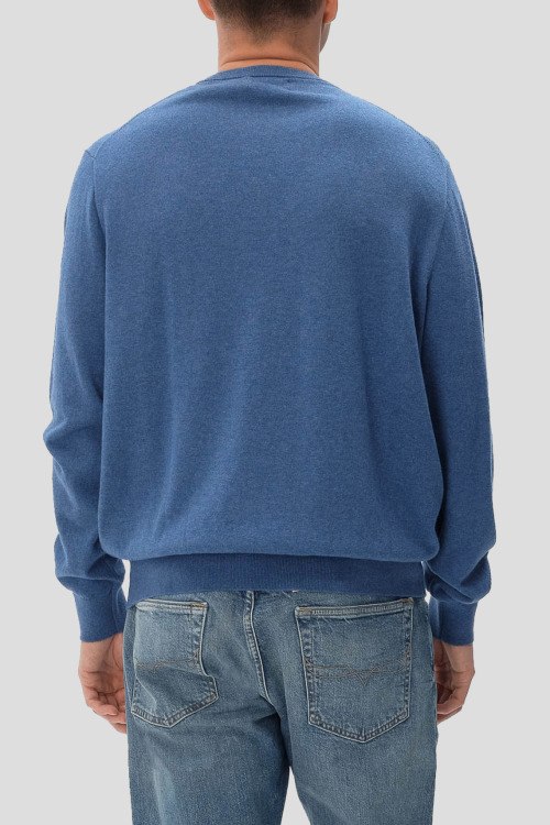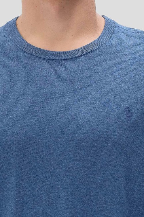 Детали: Мужской синий хлопковый джемпер от Polo Ralph Lauren (Поло Ральф Лорен). Модель с примесью кашемира, логотип на груди, круглый вырез горловины, классическая длина