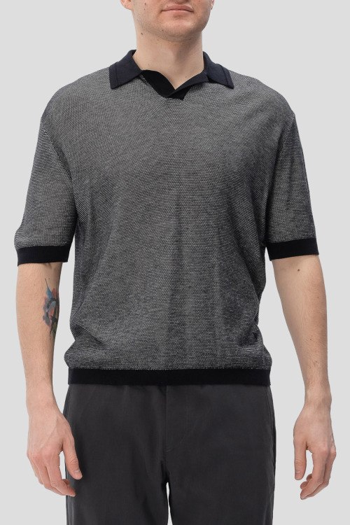 Детали: Мужской темно-серый джемпер-поло из лиоцелла, шерсти и шелка от Emporio Armani (Эмпорио Армани). Классический воротник, V-образный вырез горловины, контрастная окантовка