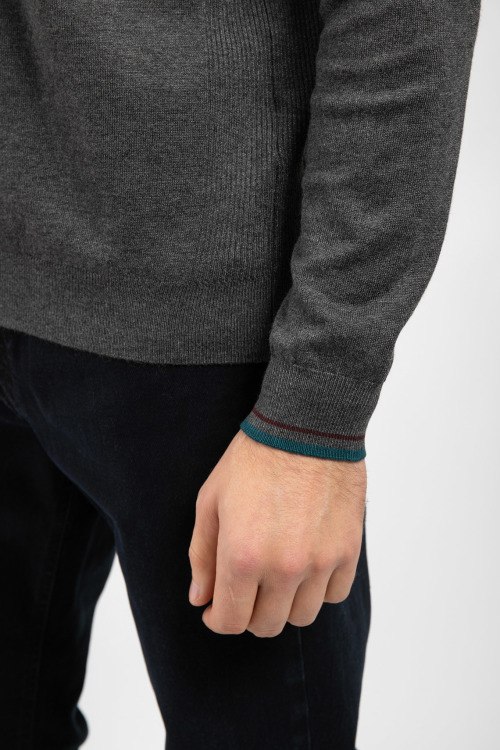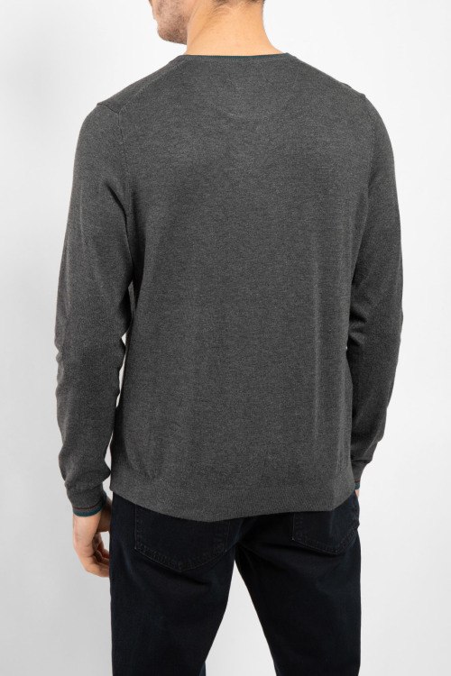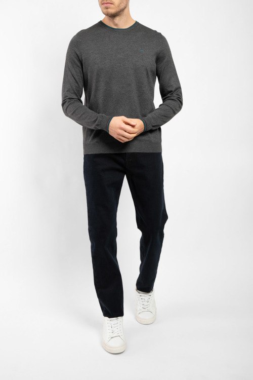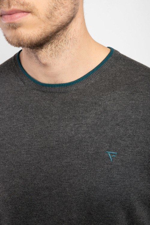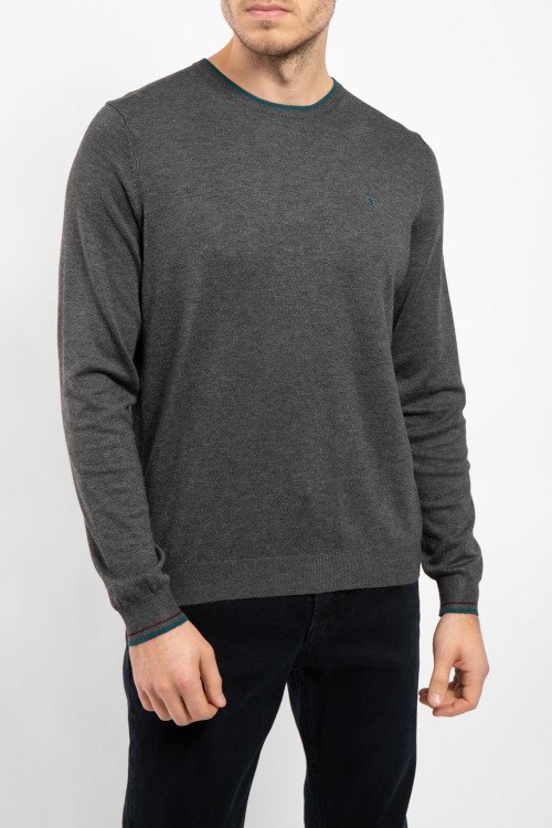 Мужской темно-серый джемпер из вискозы и полиамида от Fred Mello (Фред Мелло). Классическая длина, круглый вырез горловины, длинные рукава, вышитый логотип бренда на груди, манжеты в рубчик.