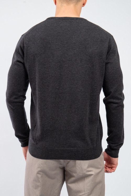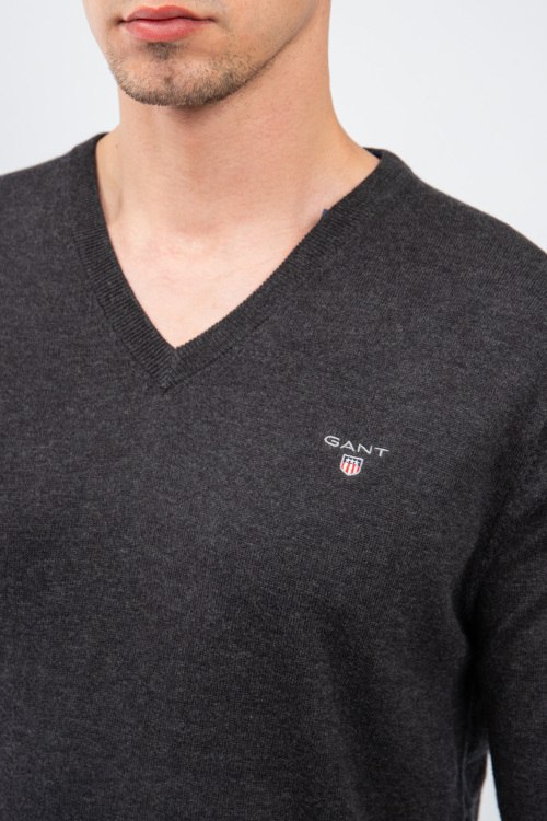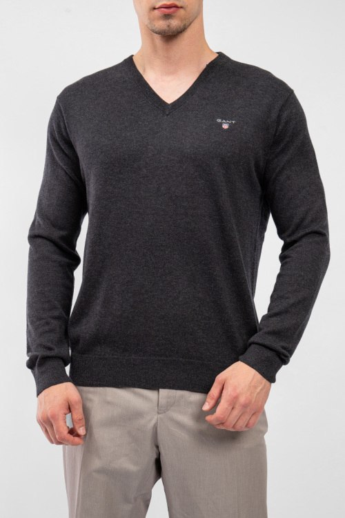Детали: Мужской темно-серый пуловер из хлопка и шерсти от Gant (Гант). V-образный вырез, логотип на груди, классическая длина, ребристые манжеты и нижний край