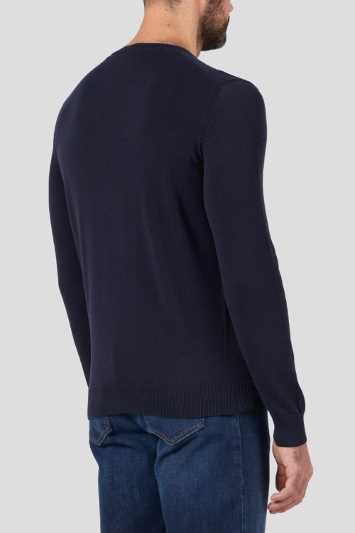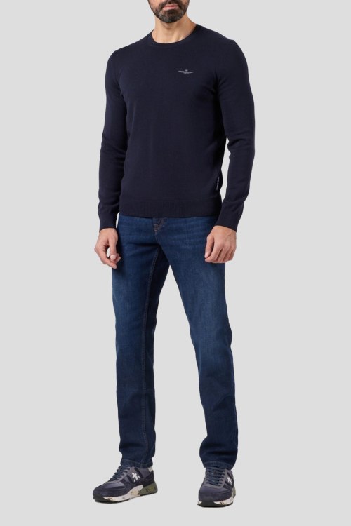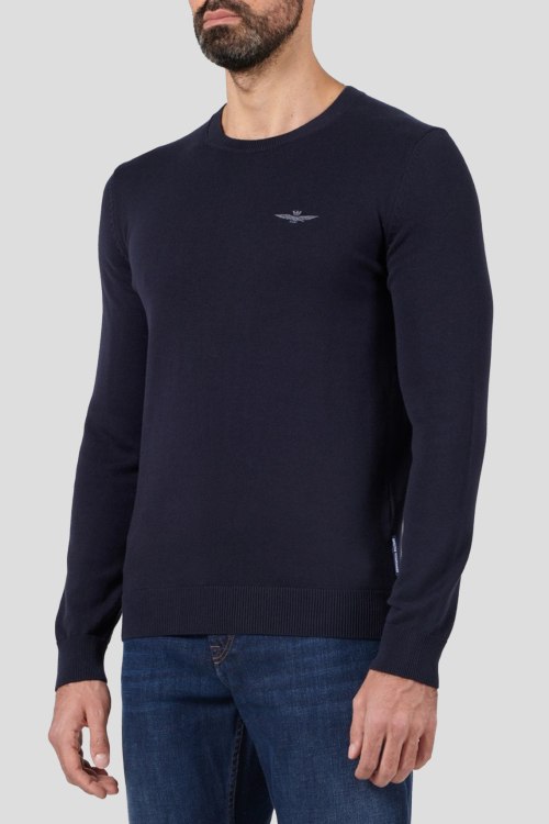 Детали: Мужской темно-синий хлопковый джемпер от Aeronautica Militare (Аэронавтика Милитари). Логотип на груди, круглый вырез горловины, классическая длина, манжеты и нижний край в рубчик