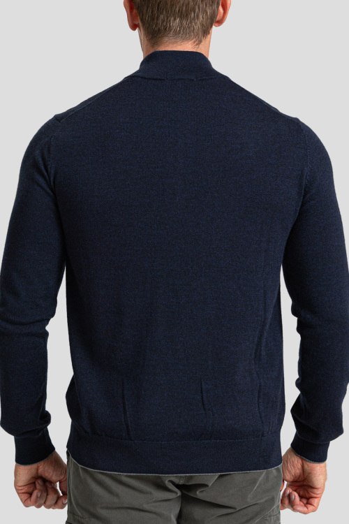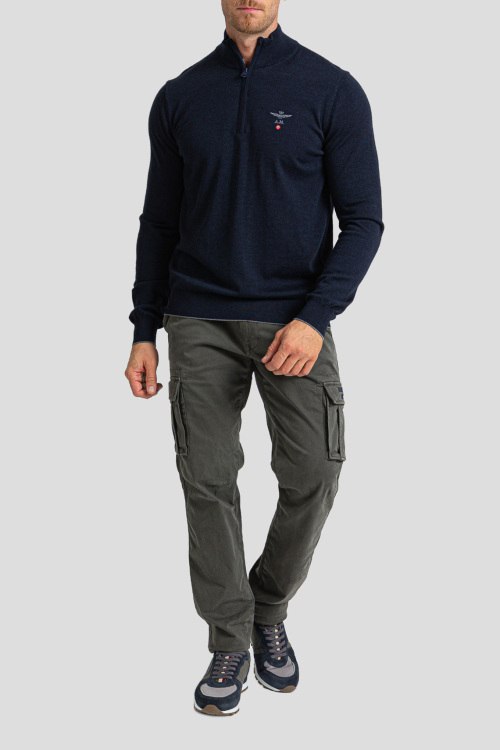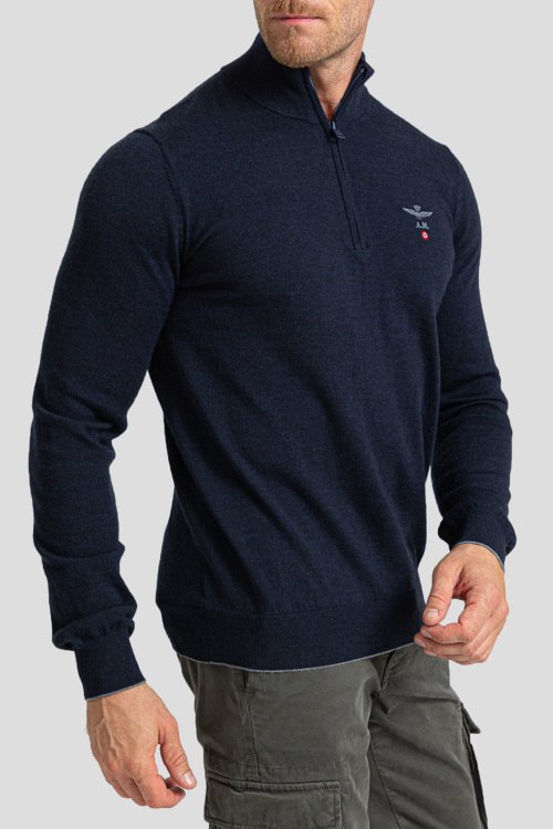 Детали: Мужской темно-синий джемпер из шерсти из от Aeronautica Militare (Аэронавтика Милитари). Классическая длина, высокий воротник-стойка, горловина на молнии, брендированная вышивка на груди A.M., трикотажная резинка на манжетах и по низу изделия
