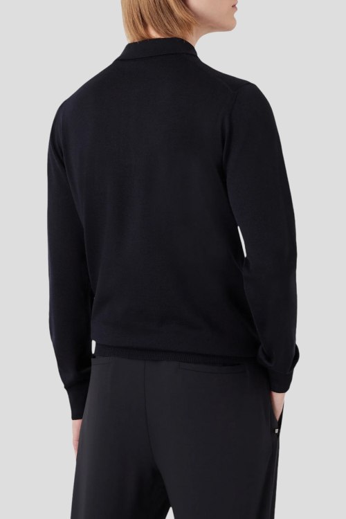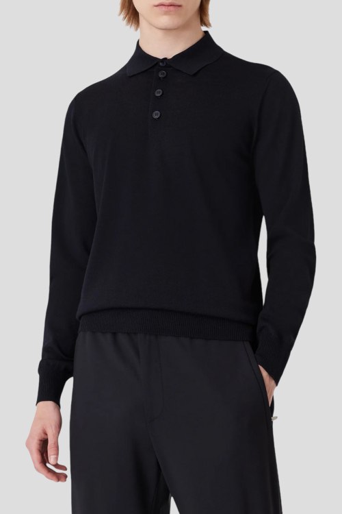 Детали: Мужской темно-синий шерстяной джемпер-поло от Emporio Armani (Эмпорио Армани). Отложной воротник, застежка на пуговицы, классическая длина, манжеты и нижний край в рубчик