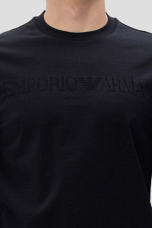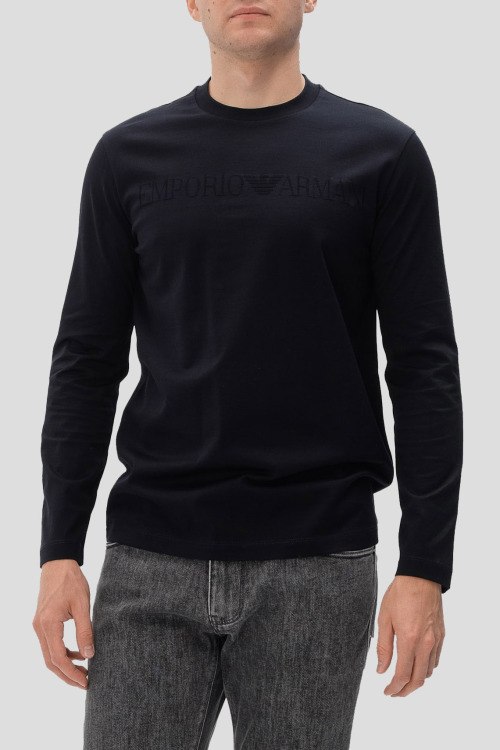 Детали: Мужской темно-синий хлопковый лонгслив от Emporio Armani (Эмпорио Армани). Логотип на груди, круглый вырез горловины, классическая длина