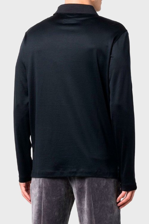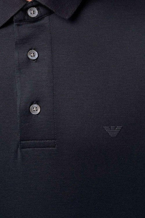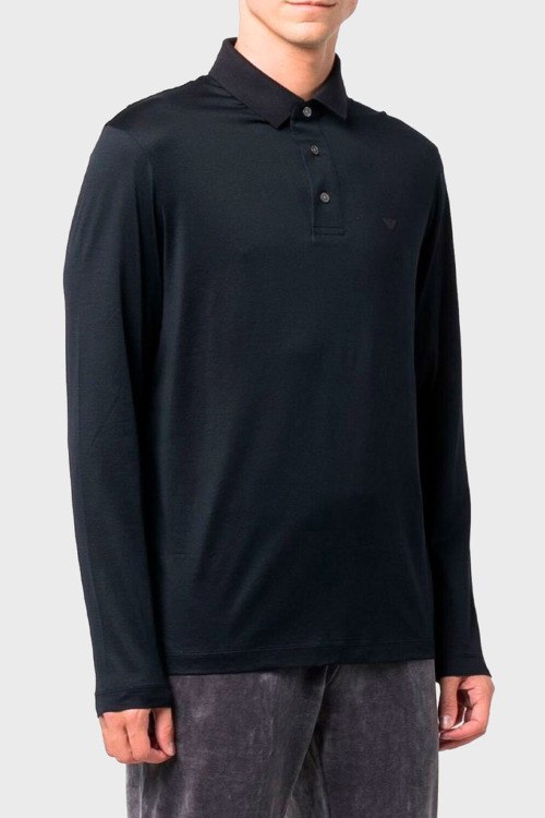 Детали: Мужской темно-синий джемпер-поло из лиоцелла и хлопка от Emporio Armani (Эмпорио Армани). Логотип на груди, отложной воротник, застежка на три пуговицы, длинный рукав, классическая длина