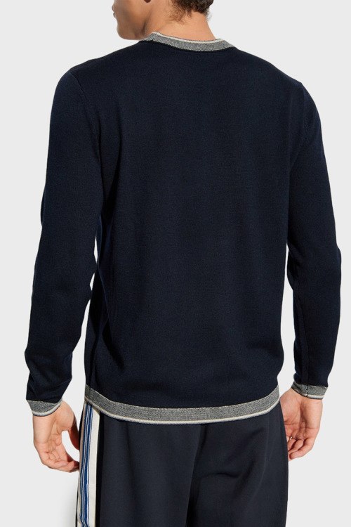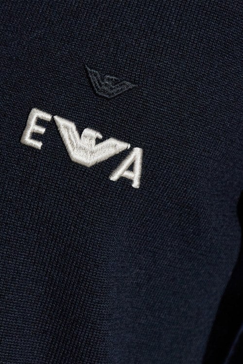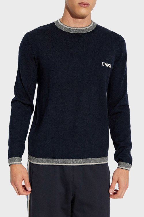 Детали: Мужской темно-синий шерстяной джемпер от Emporio Armani (Эмпорио Армани). Логотип на груди, круглый вырез горловины, длинный рукав, классическая длина