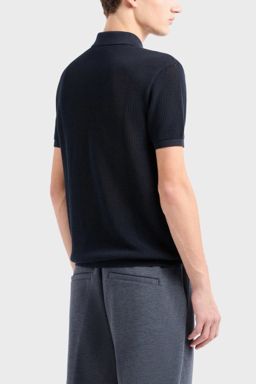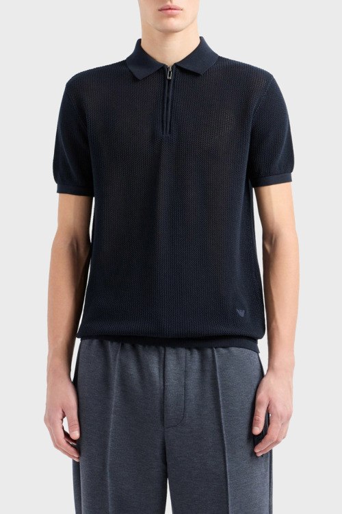 Детали: Мужской темно-синий хлопковый джемпер-поло от Emporio Armani (Эмпорио Армани). Классическая вязка, отложной воротник, застежка-молния, короткий рукав, классическая длина