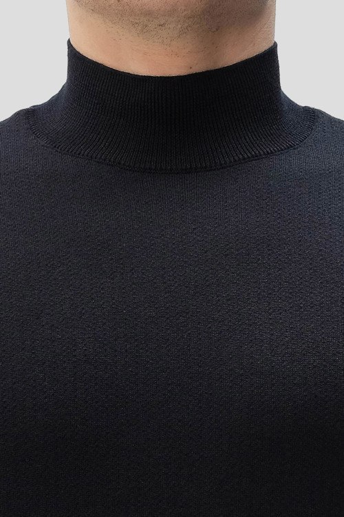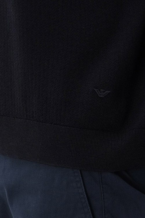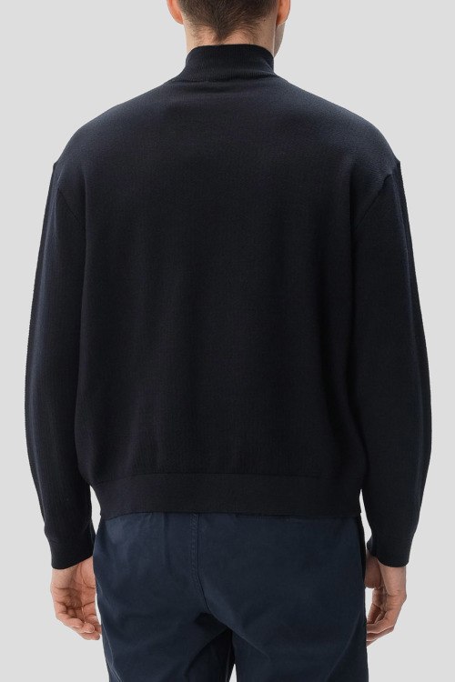 Детали: Мужской темно-синий джемпер из шерсти от Emporio Armani (Эмпорио Армани). Классическая длина, воротник-стойка, длинные рукава, манжеты и низ изделия в рубчик, вышитый лого
