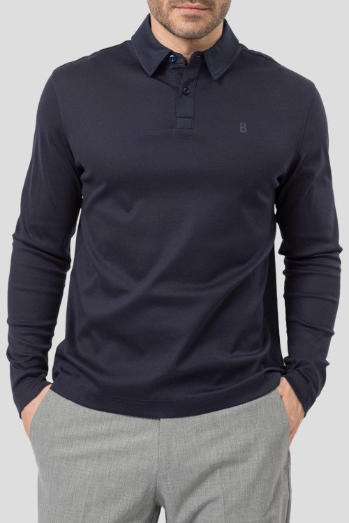Детали: Мужской темно-синий хлопковый джемпер-поло Mika от Bogner (Богнер). Логотип на груди, отложной воротник, застежка на две пуговицы, длинный рукав, классическая длина