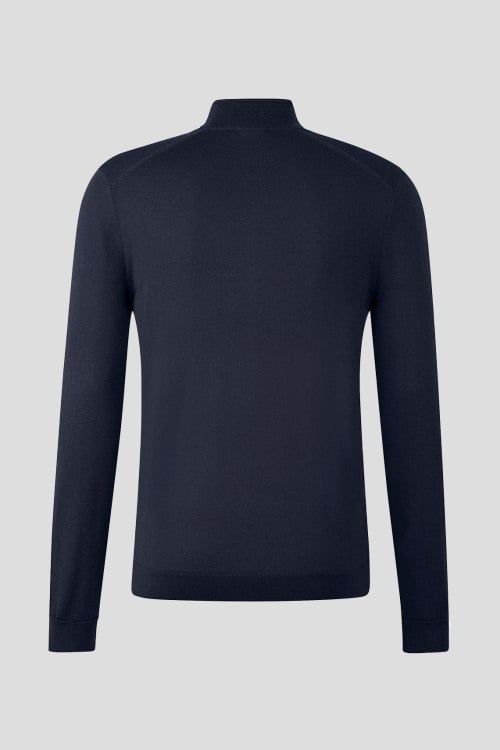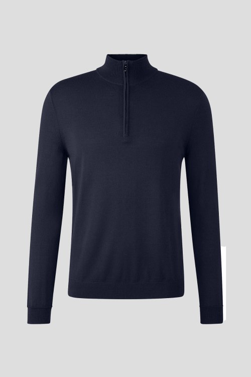 Детали: Мужской темно-синий джемпер Ouri от Bogner (Богнер). Высокий воротник, застежка-молния, классическая длина, ребристые манжеты и нижний край