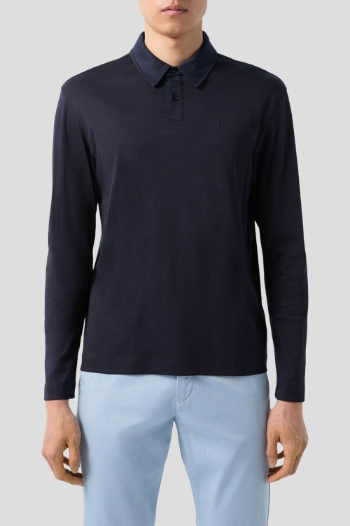Детали: Мужское темно-синее поло Mika из хлопка от Bogner (Богнер). Классический воротник, горловина на пуговицы, длинные рукава, логотип бренда на груди