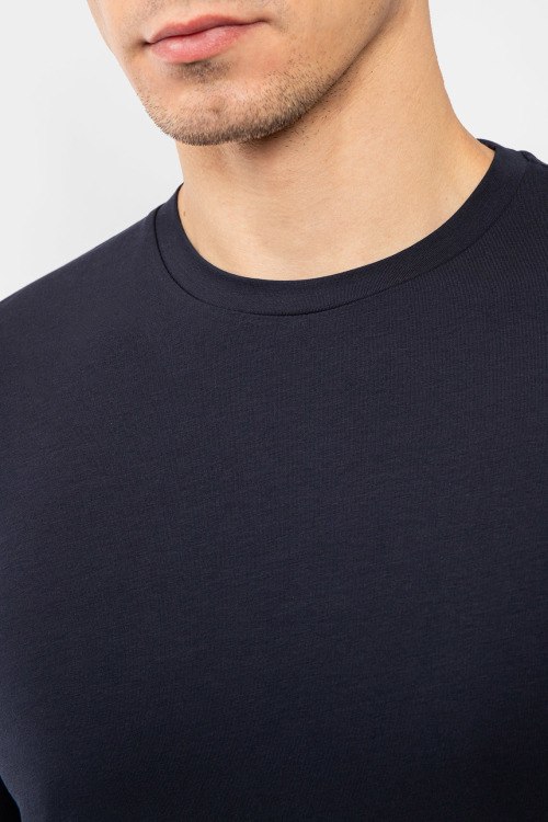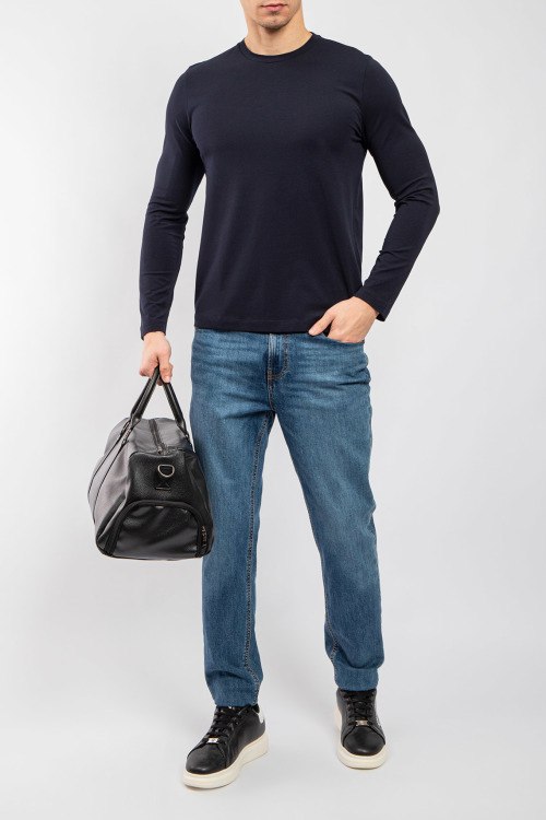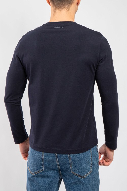 Детали: Мужской темно-синий хлопковый лонгслив от Corneliani (Корнелиани). Круглый вырез горловины, ждлинный рукав, классическая длина. Размер вещи на фото: 50