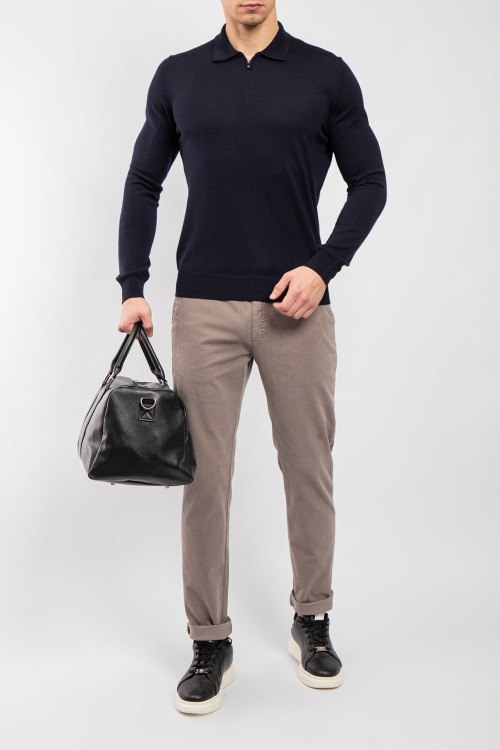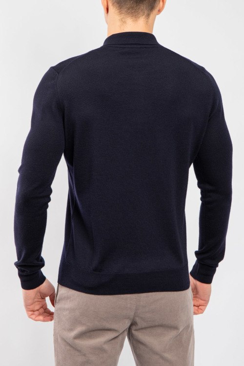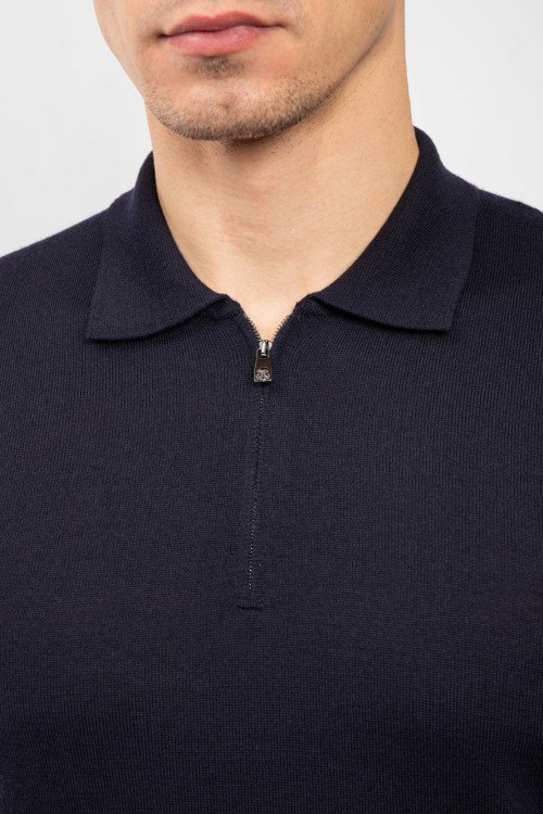 Детали: Мужской темно-синий шерстяной джемпер-поло от Corneliani (Корнелиани). Отложной воротник, застежка-молния, классическая длина, ребристые манжеты и нижний край. Размер вещи на фото: 50