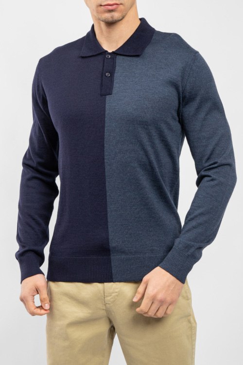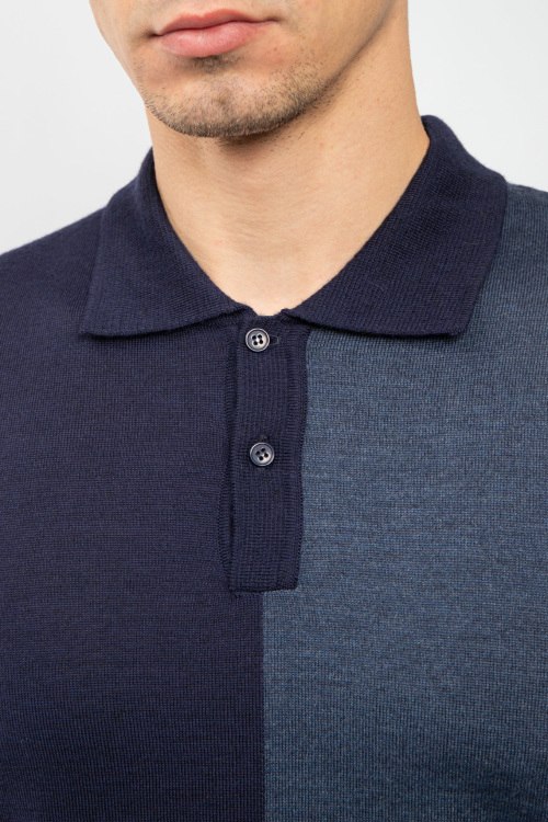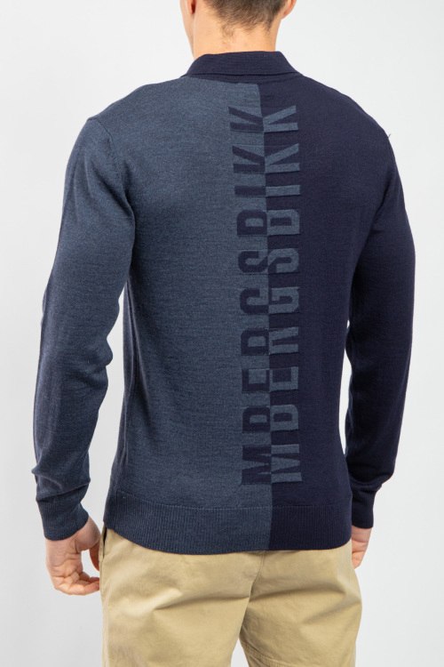 Мужской темно-синий джемпер-поло из шерсти и акрила от Bikkembergs (Биккембергс). Логотип на спине, отложной воротник, застежка на две пуговицы, классическая длина, ребристые манжеты и нижний край.