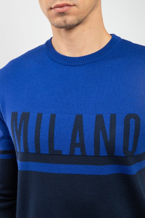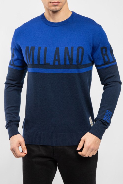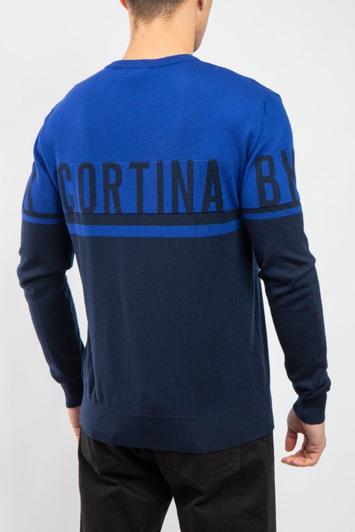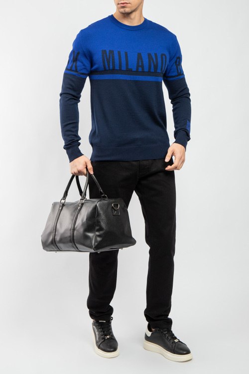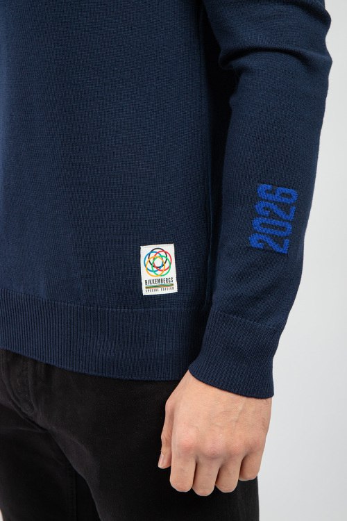 Мужской темно-синий шерстяной джемпер от Bikkembergs (Биккембергс). Надпись на груди, на спине и на рукавах, круглый вырез горловины, классическая длина, ребристые манжеты и нижний край.