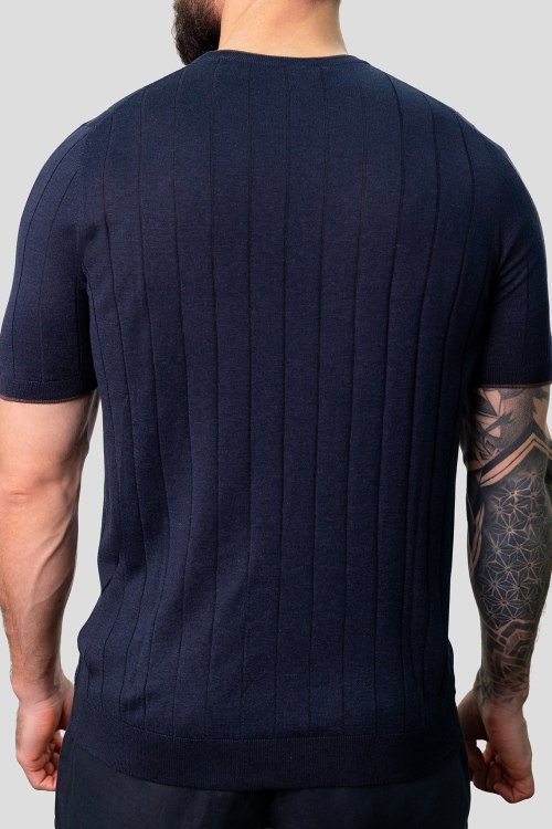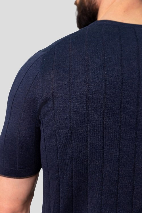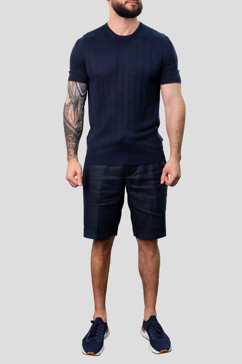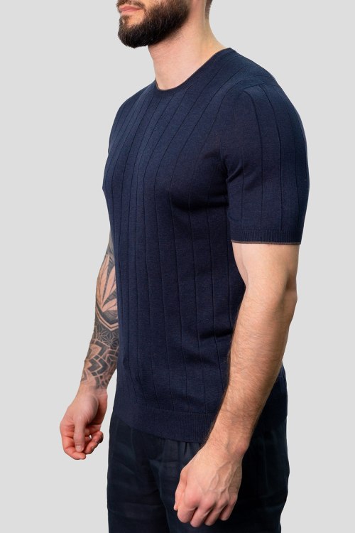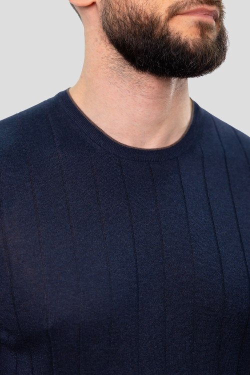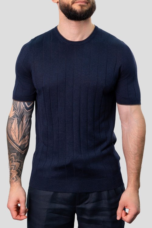 Детали: Мужской темно-синий шелковый джемпер от Gran Sasso (Гран Сассо). Круглый вырез горловины, короткий рукав, классическая длина, трикотажные манжеты и нижний край