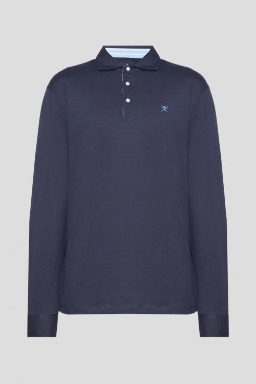 Детали: Мужской темно-синий хлопковый джемпер-поло от Hackett (Хаккетт). Логотип на груди, отложной воротник, застежка на три пуговицы, классическая длина. Обхват груди: для размера М - 102 см, обхват талии: для размера М - 100 см, длина изделия по среднему шву спинки от горловины: для размера М - 72 см