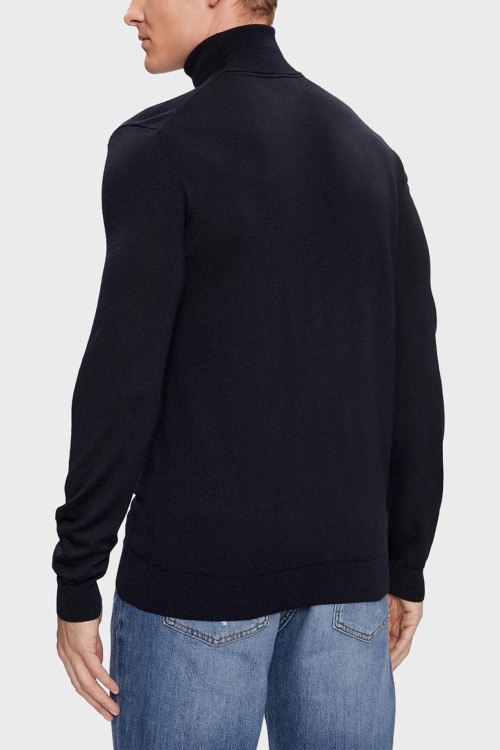 Детали: Мужской темно-синий шерстяной гольф San Thomas от Hugo by Hugo Boss (Хуго бай Хуго Босс). Высокая горловина с вышитым логотипом, классическая длина, ребристые манжеты и нижний край