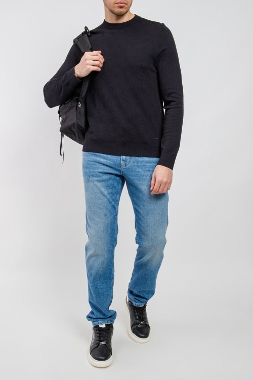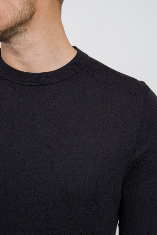 Мужской темно-синий джемпер из хлопкового микса от Joop! (Йооп!). Классическая длина, круглый вырез горловины, длинные рукава, трикотажная резинка на манжетах и по низу изделия, дизайн с узорами по всей поверхности изделия.