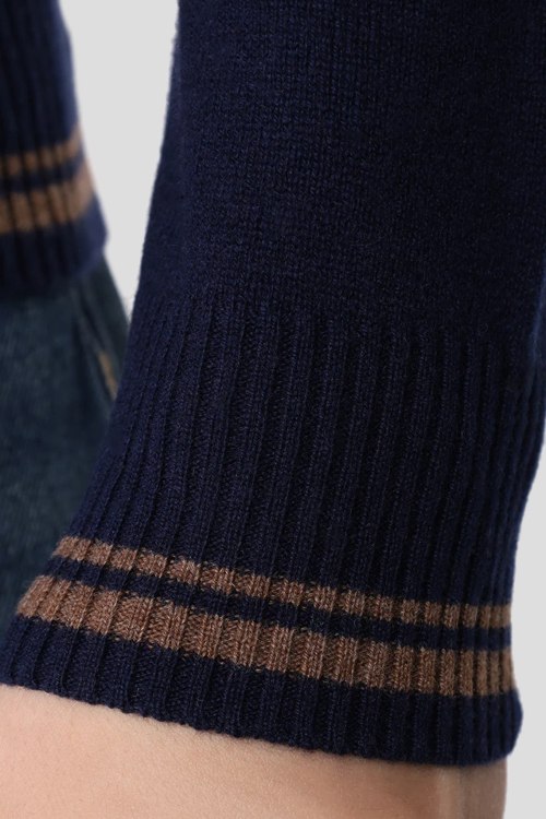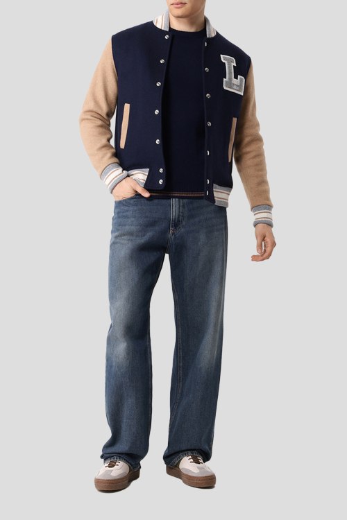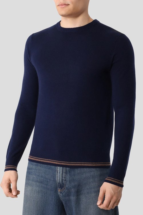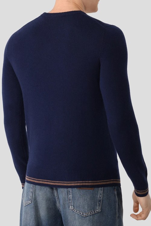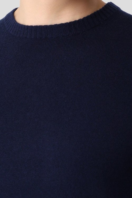 Детали: Мужской темно-синий джемпер из кашемира и шерсти от L.B.M.1911 (Л.Б.М.1911). Классическая длина, круглый вырез горловины, длинные рукава, трикотажная резинка на манжетах и по низу изделия