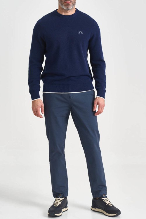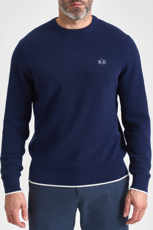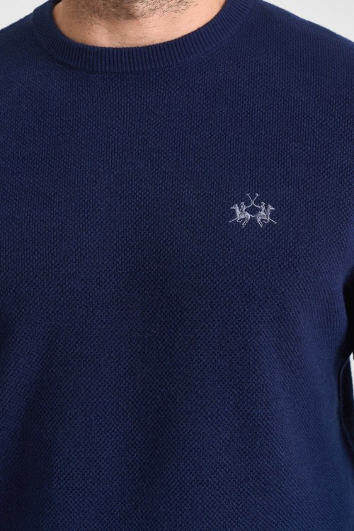 Детали: Мужской темно-синий джемпер из хлопка и шерсти от La Martina (Ла Мартина). Логотип на груди, круглый вырез горловины, классическая длина, манжеты и нижний край в рубчик. Параметры модели: 103 см - 87 см - 99 см. Рост - 182 см. Размер на фото - L