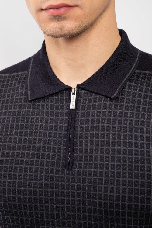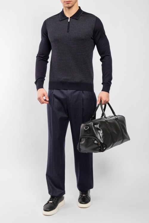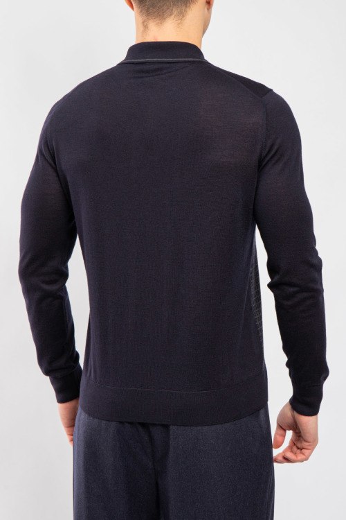 Детали: Мужской темно-синий джемпер-поло из шерсти и шелка от Panicale Cashmere (Паникале Кашемир). Отложной воротник, застежка-молния, узор спереди, классическая длина, ребристые манжеты и нижний край. Размер вещи на фото: 50