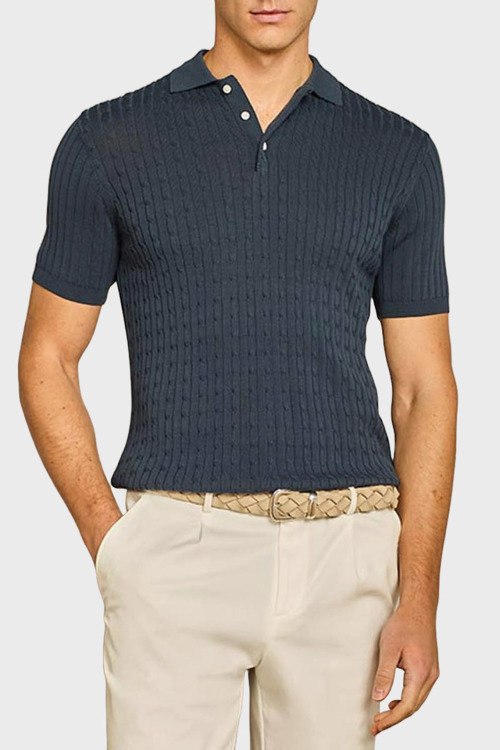 Детали: Мужской темно-синий джемпер-поло из хлопка от Paul Taylor (Пол Тейлор). Классический воротник, горловина на пуговицах, короткие рукава, фактурная вязка