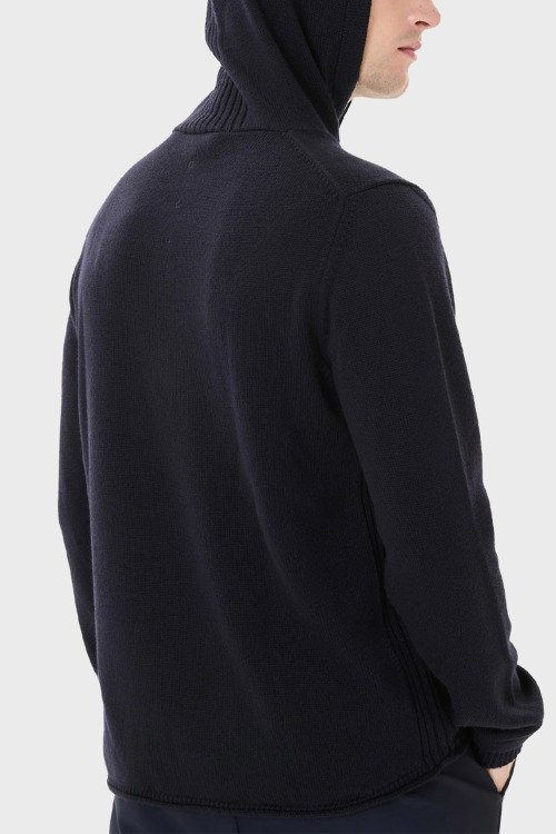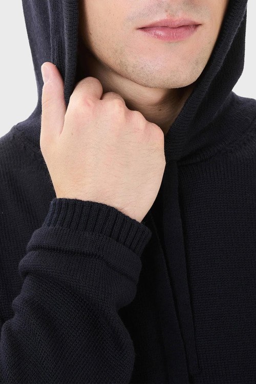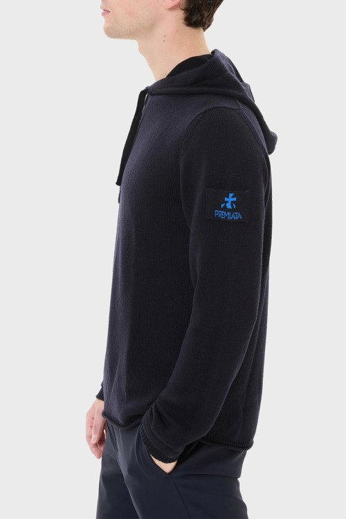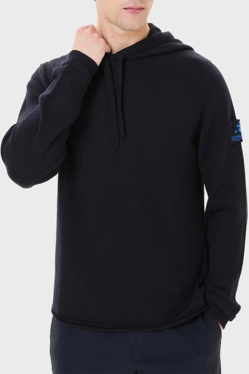 Детали: Мужской темно-синий шерстяной худи от Premiata (Премиата). Капюшон на завязках, нашивка с логотипом на рукаве, ребристые манжеты, классическая длина