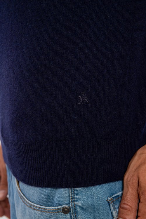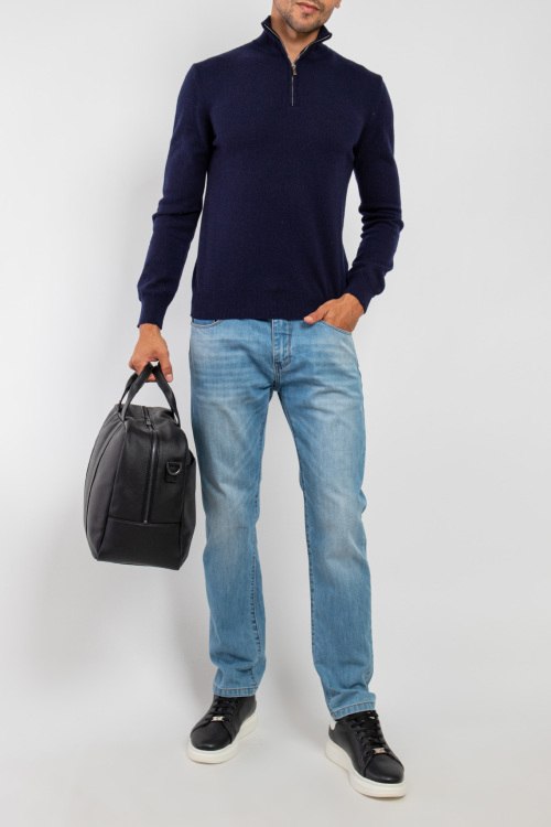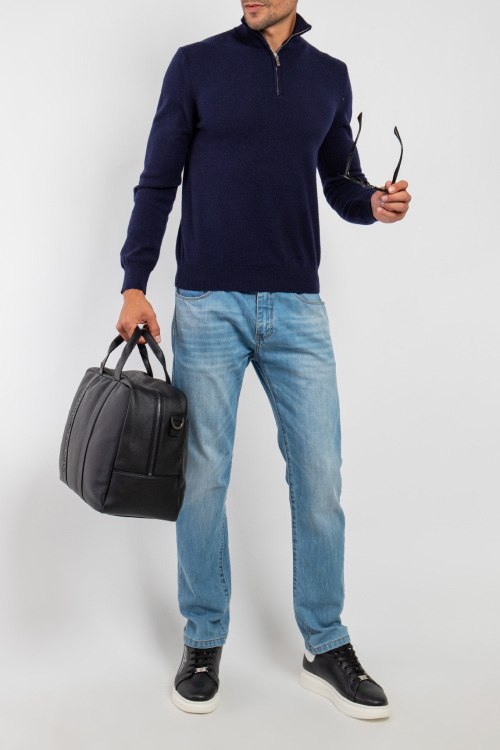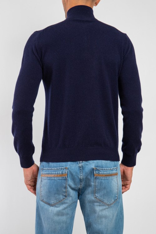 Мужской темно-синий кашемировый джемпер от Scabal (Скабал). Высокая горловина, застежка-молния, классическая длина, манжеты и нижний край в рубчик.