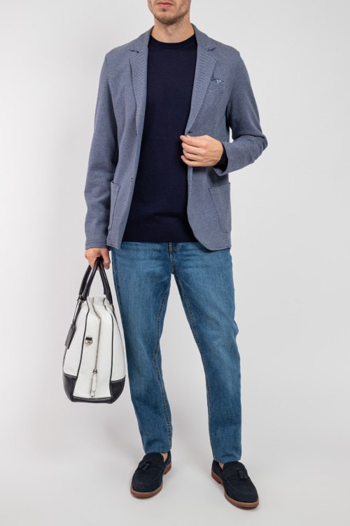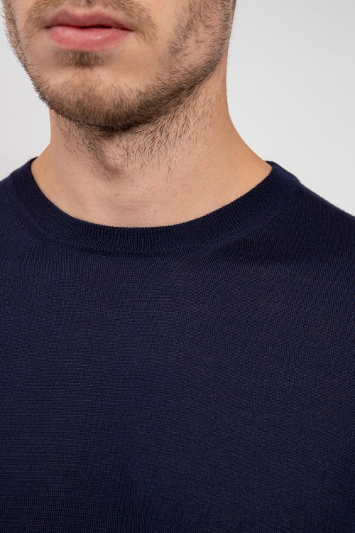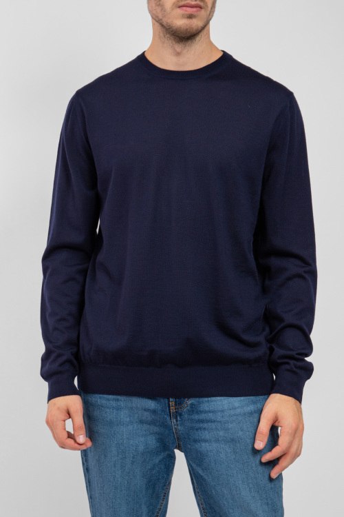 Мужской темно-синий джемпер из шерсти и шелка от Scabal (Скабал). Круглый вырез горловины, классическая длина, манжеты и нижний край в рубчик.
