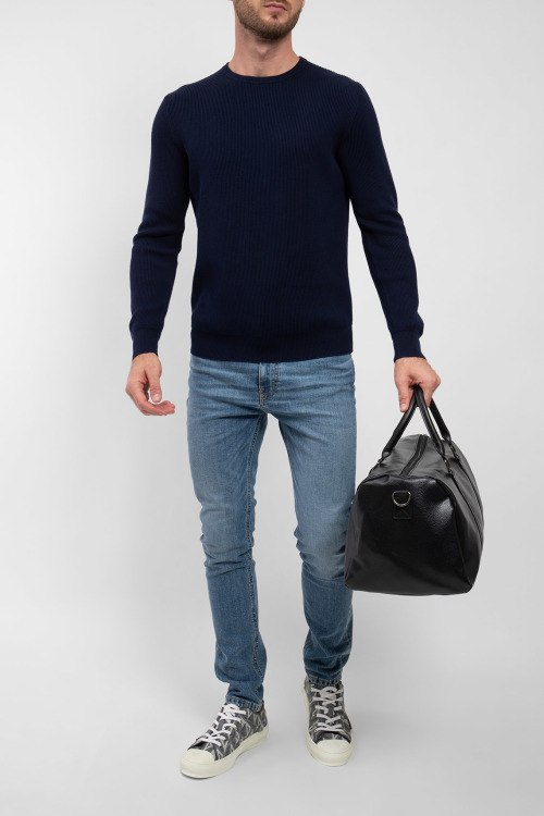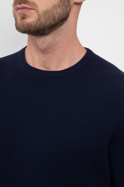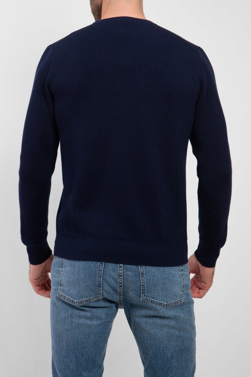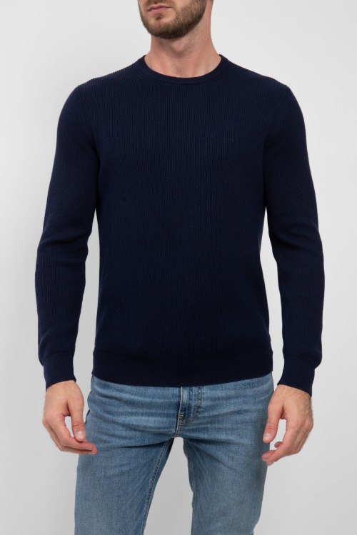 Мужской темно-синий джемпер из хлопка от Scabal (Скабал). Классическая длина, круглый вырез горловины, трикотажная резинка на манжетах и по низу изделия.