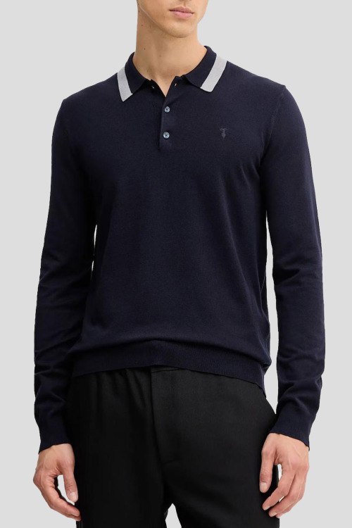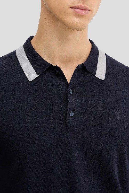Детали: Мужской темно-синий трикотажный джемпер-поло от Trussardi (Труссарди). Логотип на груди, отложной воротник, застежка на три пуговицы, длинный рукав, классическая длина