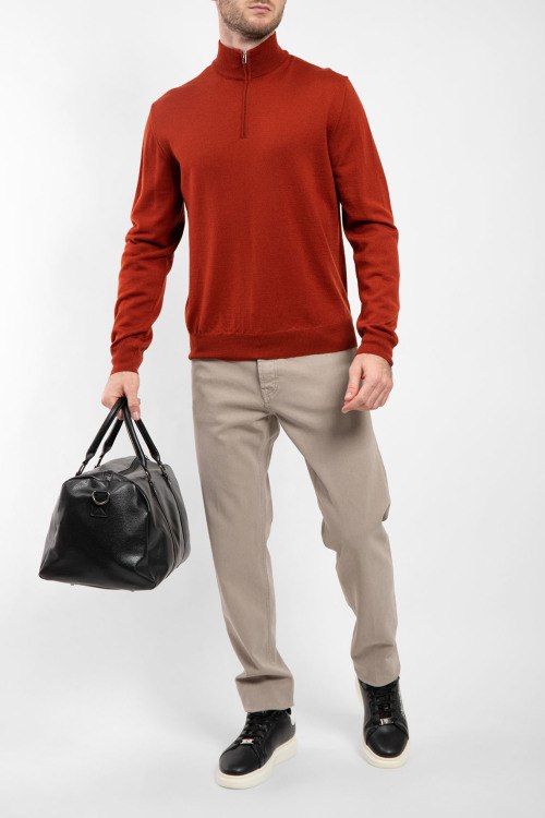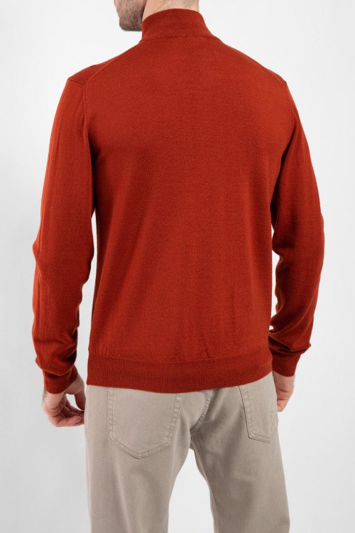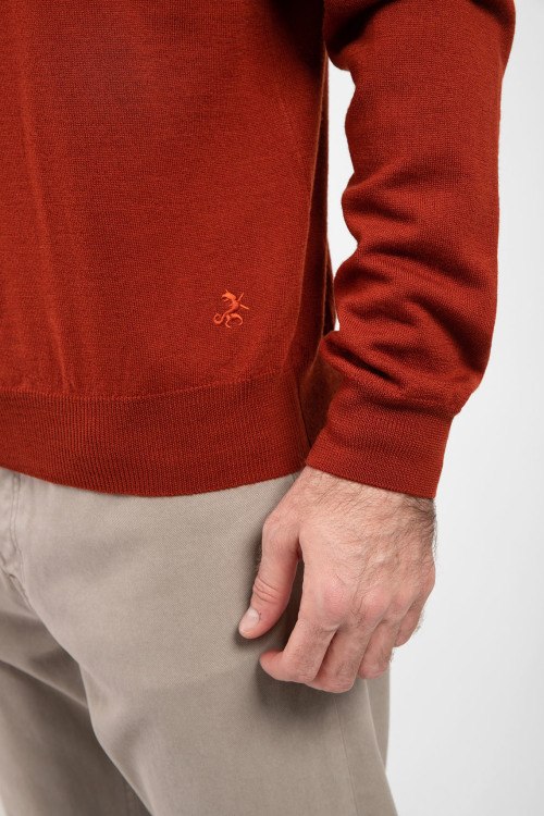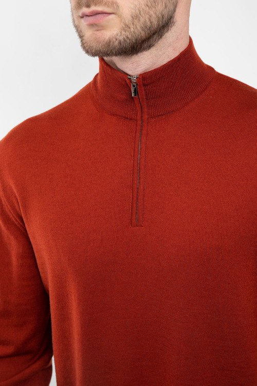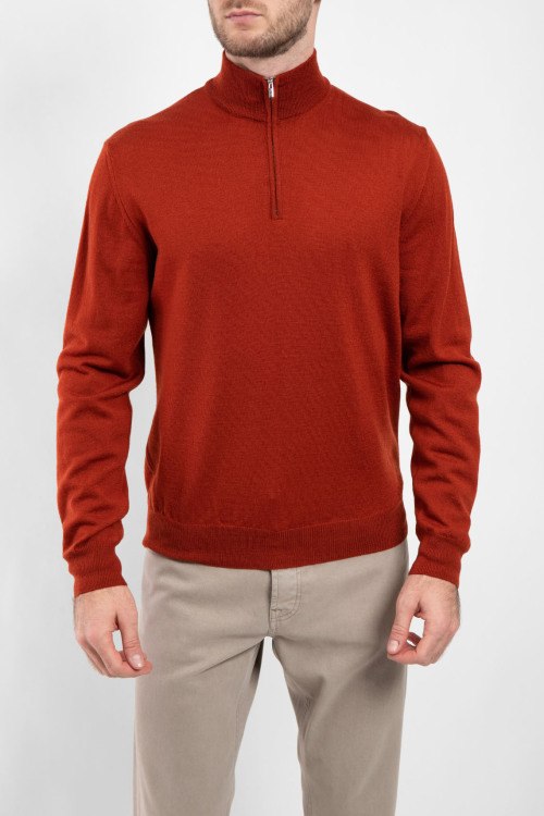 Мужской терракотовый шерстяной джемпер от Tombolini (Томболини). Вышитый логотип, воротник-стойка, застежка-молния, классическая длина, ребристые манжеты и нижний край.